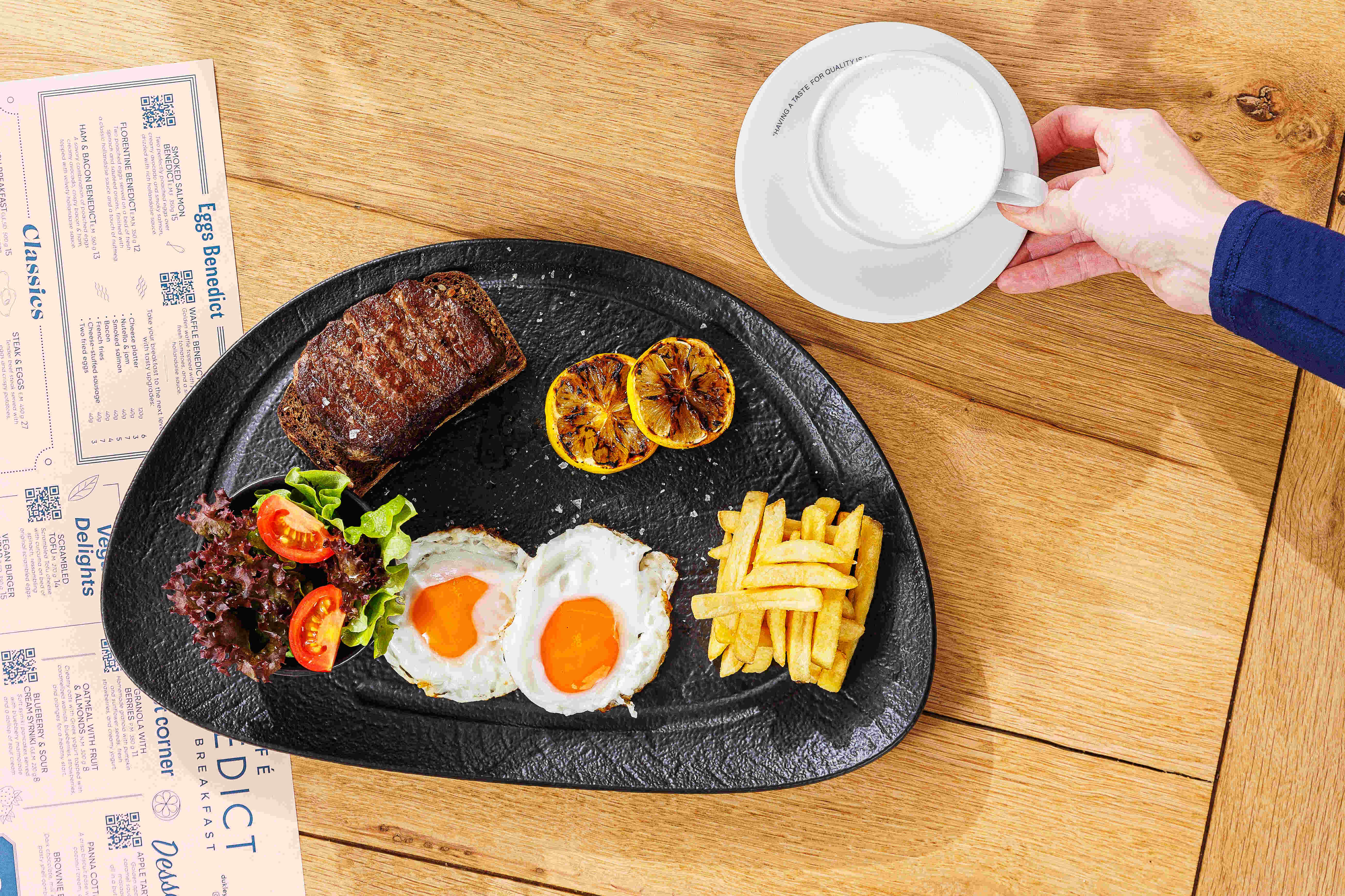 Our brand new menu brings even more to the table: rich Benedicts, hearty English breakfasts, sweet waffles, vibrant bowls, street food favorites, and indulgent desserts - all served from morning until evening.